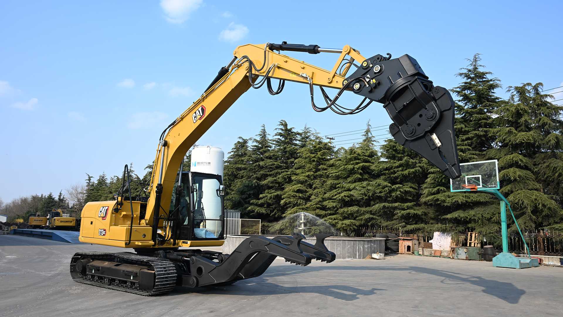 拆车剪与拆车压车架组合应用,CAT 313GC即刻变身拆解报废汽车神器。